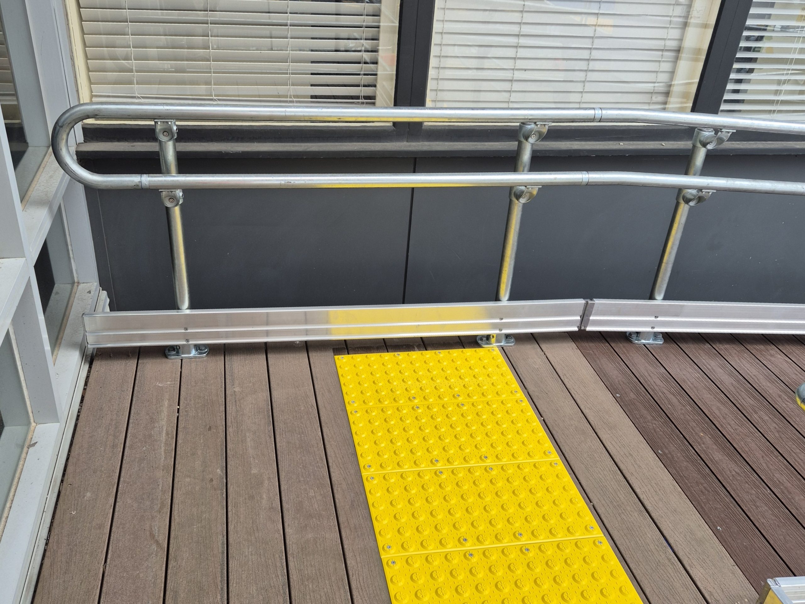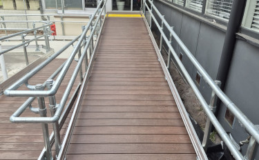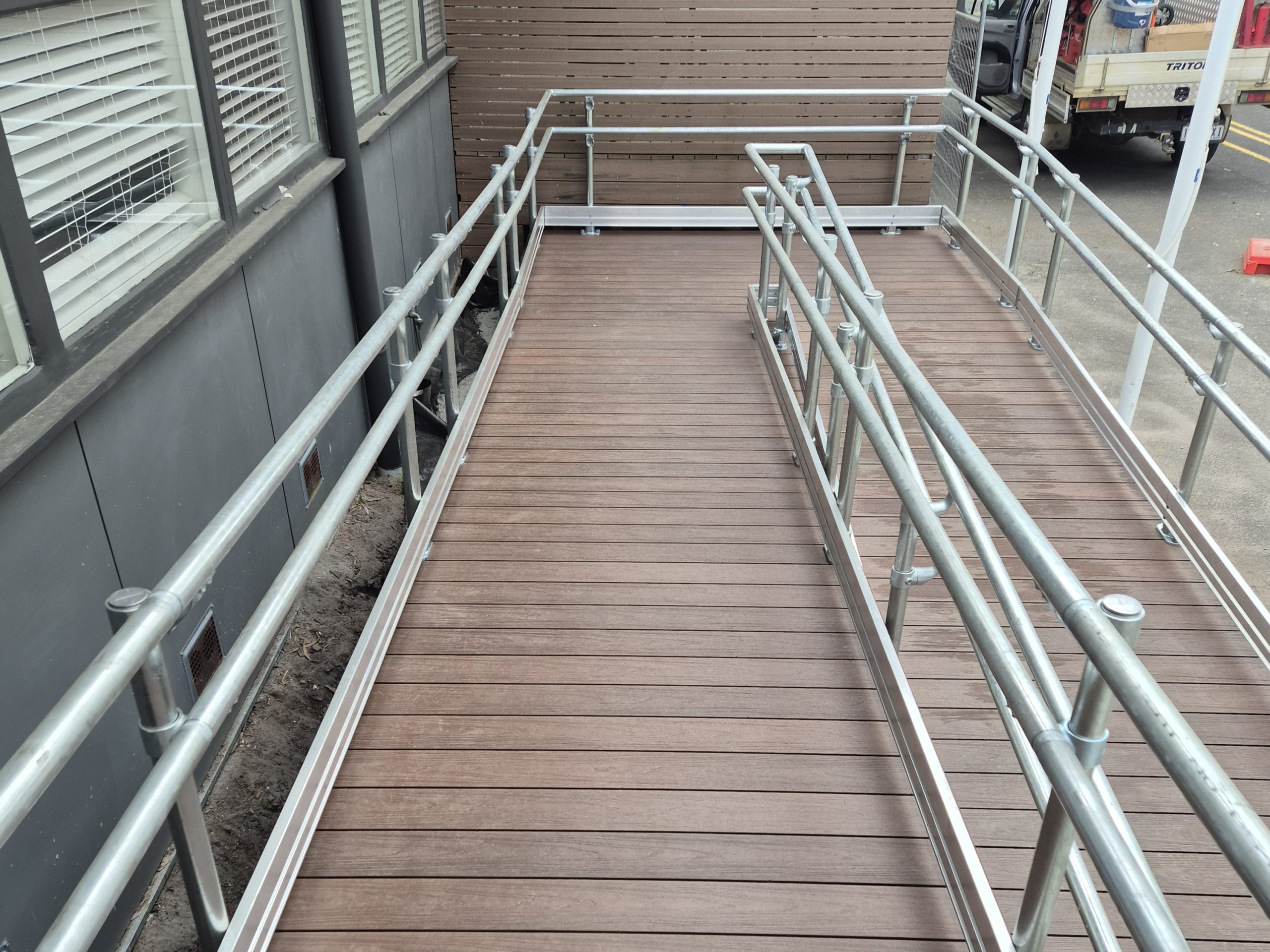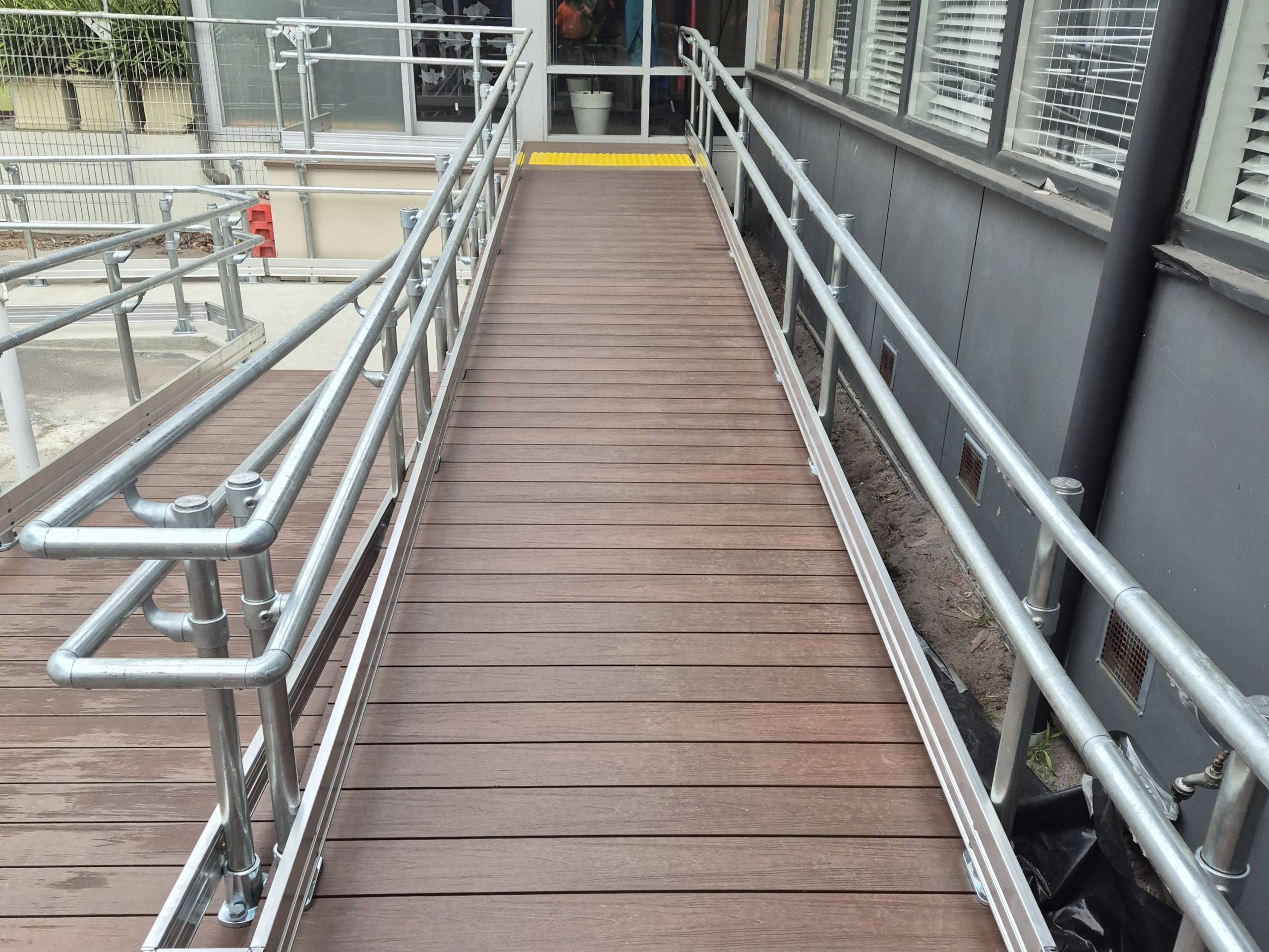 Moddex delivered a complete accessibility package featuring Ezibilt™ ramps supported by Assistrail® handrails, and Conectabal® commercial balustrade systems. Two new Ezibilt™ adjustable ramps — one switchback and one L-shaped — were installed with Flexalyte kerbrail, Ekodeck composite decking and Duratec Eco Hazard Tiles to achieve full DDA compliance. The balustrade system provided dual height handrails to meet NCC and VSBA requirements for primary schools and was securely fixed to existing timber posts using proprietary Moddex fittings. All systems were prefabricated, hot dip galvanised and installed without welding, supplied with Reg 126 certification and built for long term durability and easy maintenance.