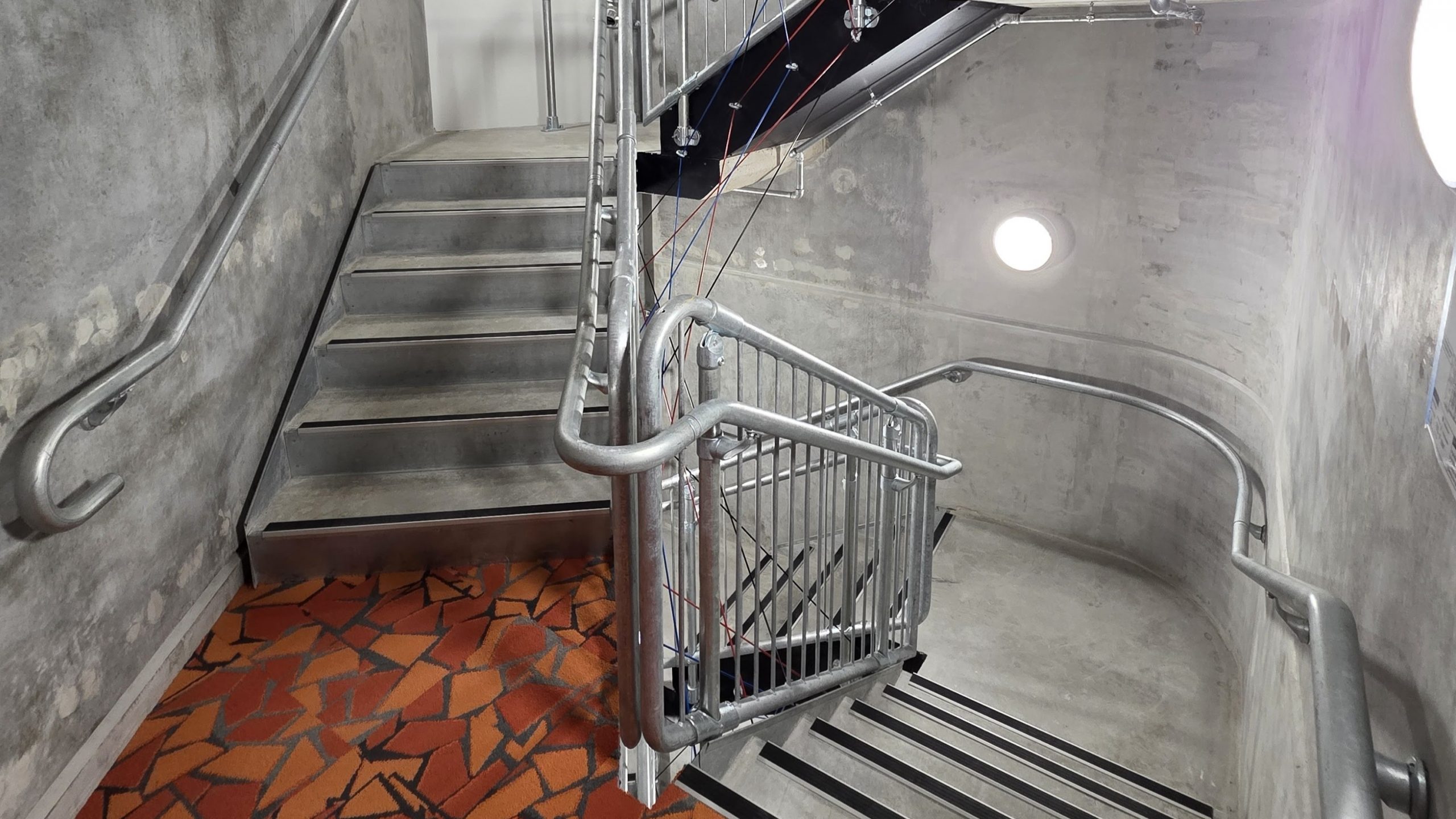 Using Assistrail AR150 and Conectabal CB40, Moddex provided a no-weld, modular system that simplified installation and minimised disruption to other trades. The pre-positioned baseplates significantly improved installation speed and ensured precise alignment across all 18 levels and other smaller stairwells.